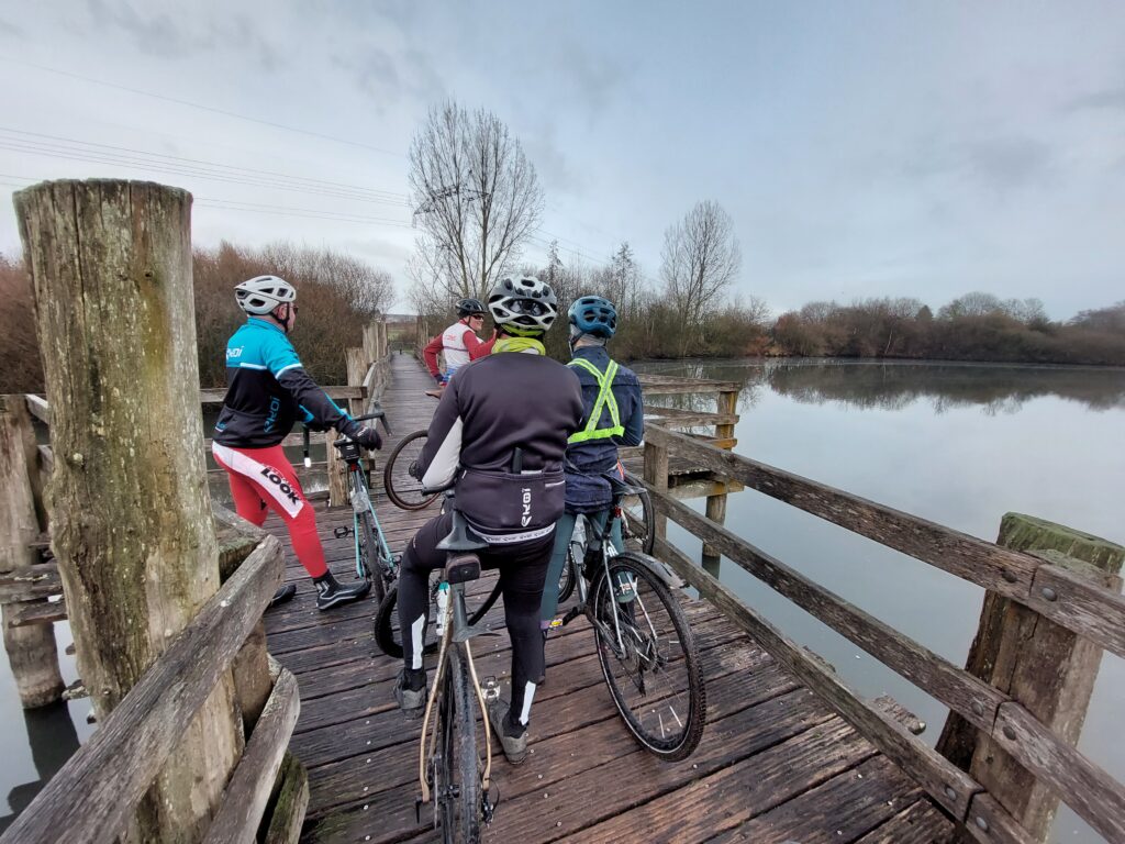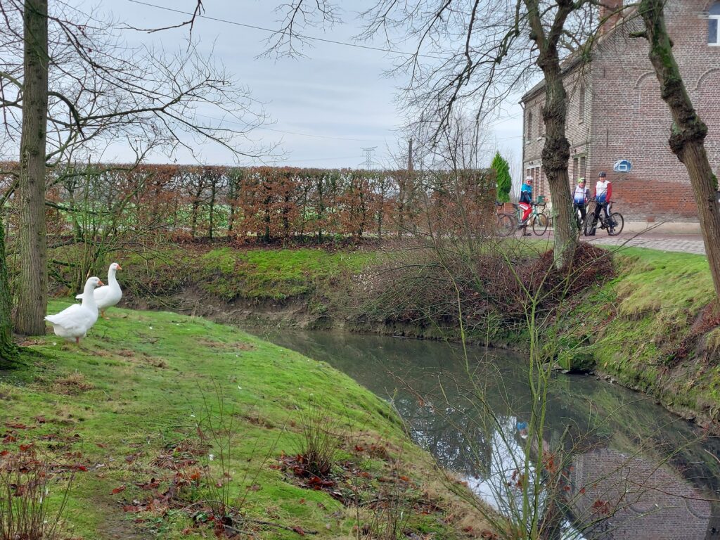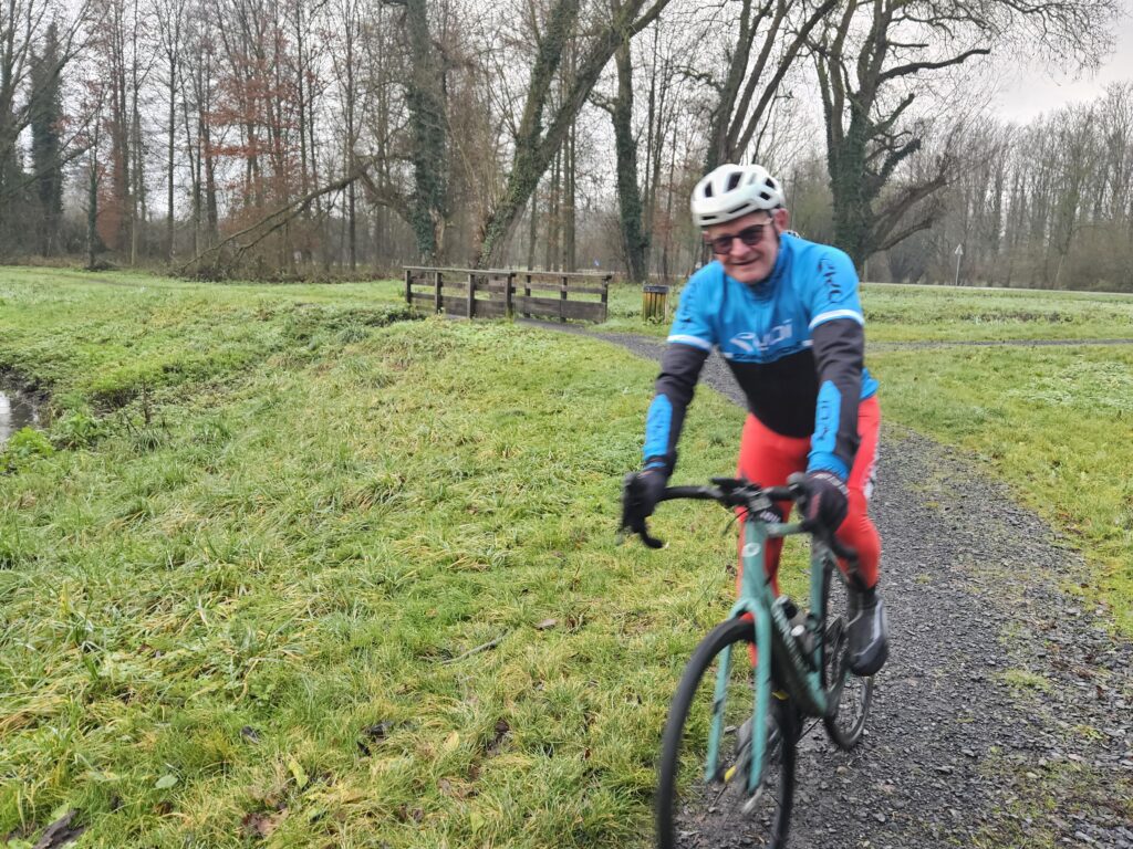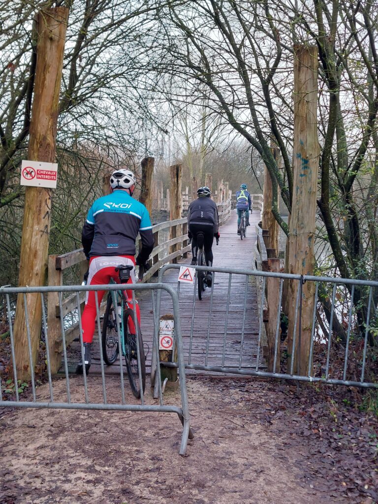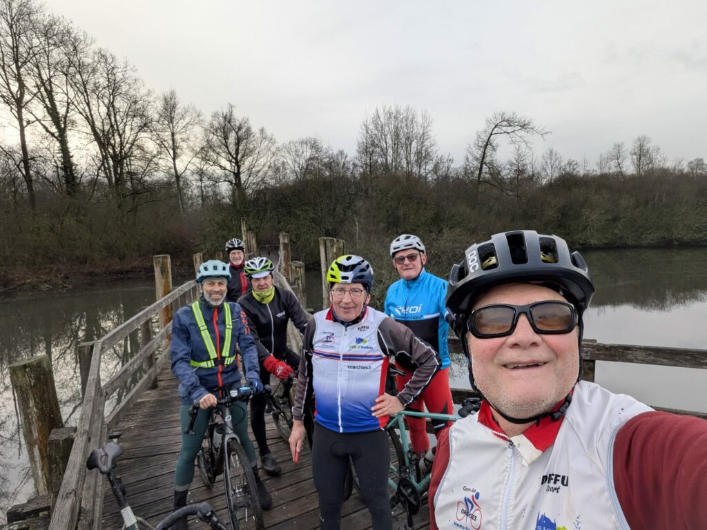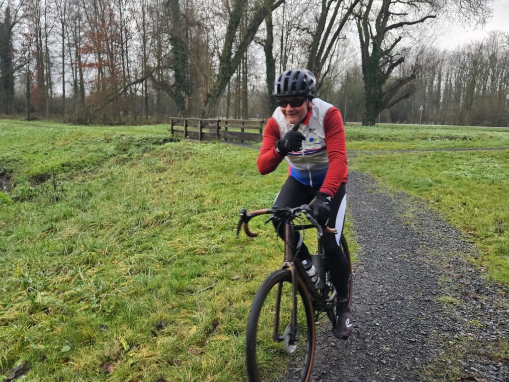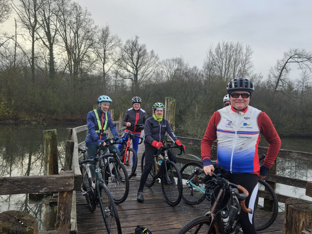 Notre escapade s’est poursuivie jusque Fretin en empruntant un joli chemin longeant la rivière de la Marque. Les photos nous montrent des cyclos bien posés sur leur machine et visiblement ravis de pratiquer le gravel 😀. En tête notre président😀