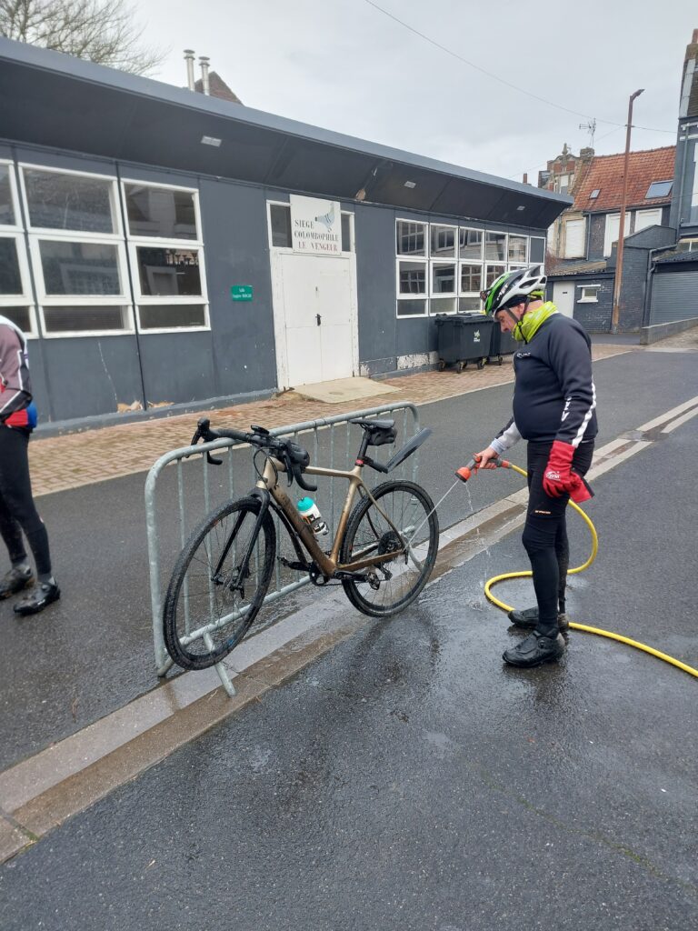 Et tout ça se termine par un lavage de nos vélos, ici Hervé en pleine action