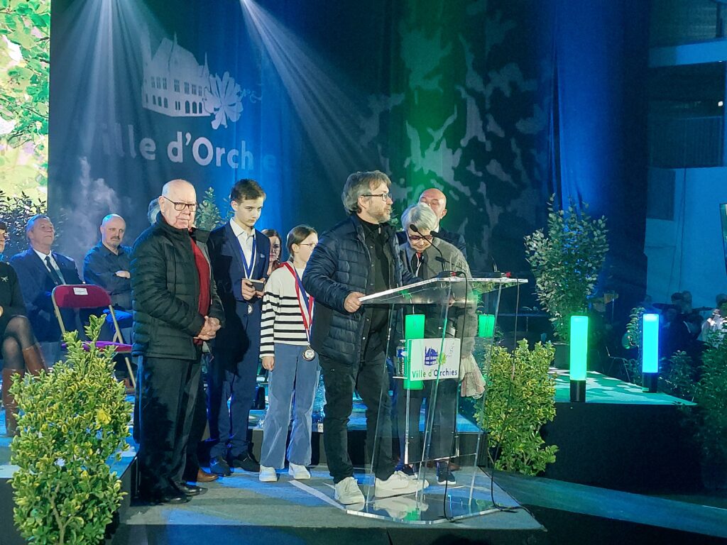Une première pour la traditionnelle cérémonie des voeux de la municipalité. Devant 1500 personnes M Ludovic Rohart Maire d’Orchies n’a pas remis la médaille de la ville à une personne méritante dans la vie locale orchésienne mais à une famille complète ! Josiane, Gustave et David ont été appelés sur scène par M le Maire pour leur engagement dans la section course depuis 26 ans. Une juste reconnaissance de 26 ans de dévouement, de bénévolat, de beaux moments de convivialité, de bonheur. Une reconnaissance également de notre club dans la vie associative orchésienne.